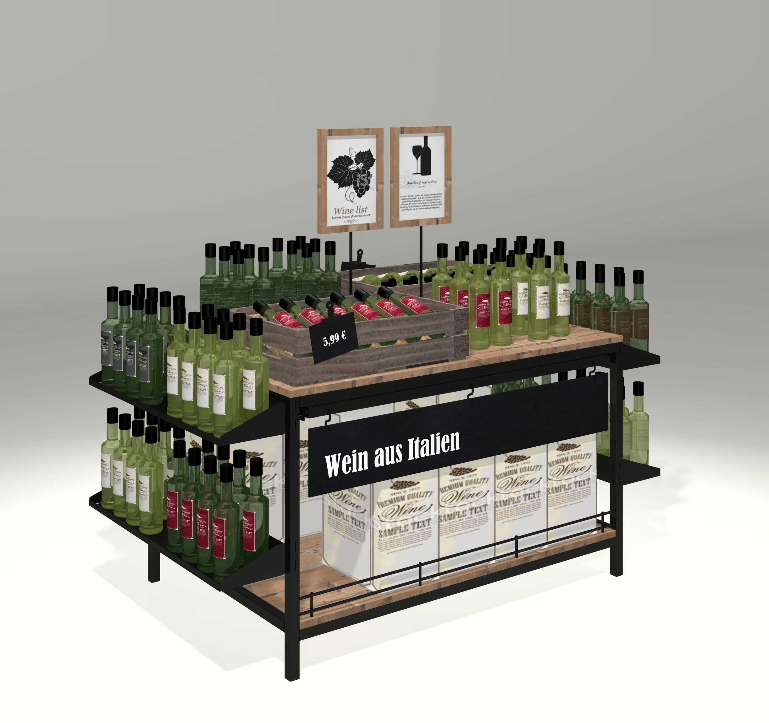 Sales table with universal application for many industries and products. The height adjustable bottom grates enable optimum adjustment for different quantities of goods.